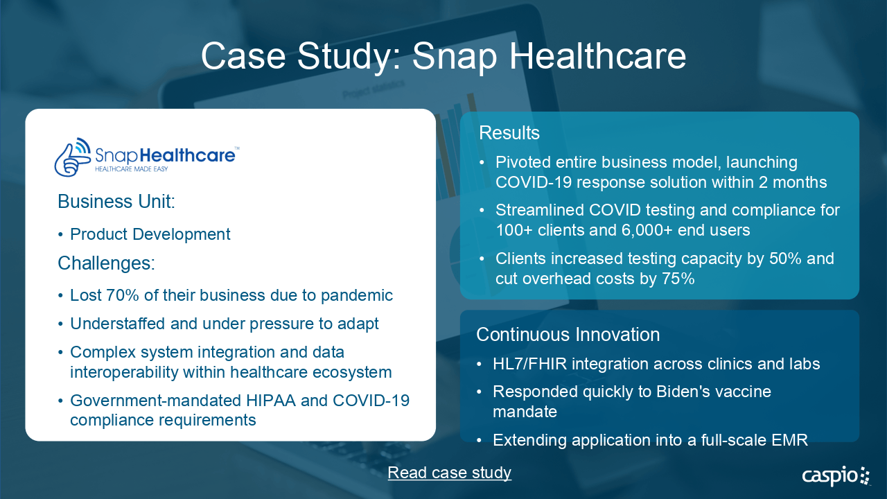 Pivoted entire business model, launching COVID-19 response solution within 2 months.Streamlined COVID testing and compliance for 100+ clients and 6,000+ end users
